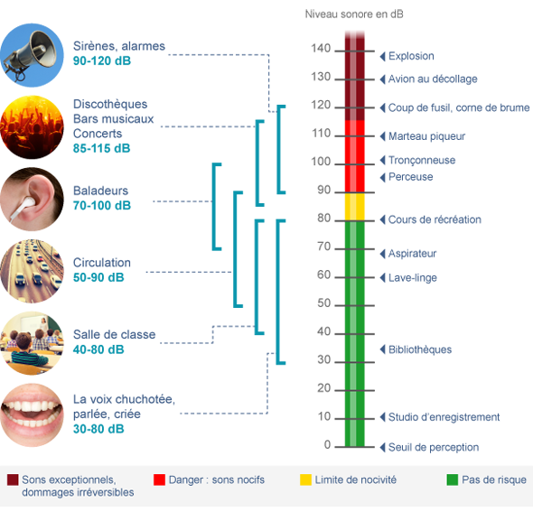 Être exposé à un bruit d'une intensité sonore de 100 dB durant moins d'une minute est moins dangereux qu'être exposé à un bruit évalué à 80 dB durant plus de 8 heures ...