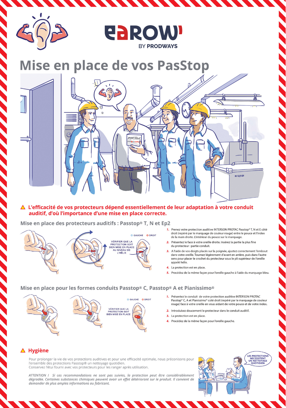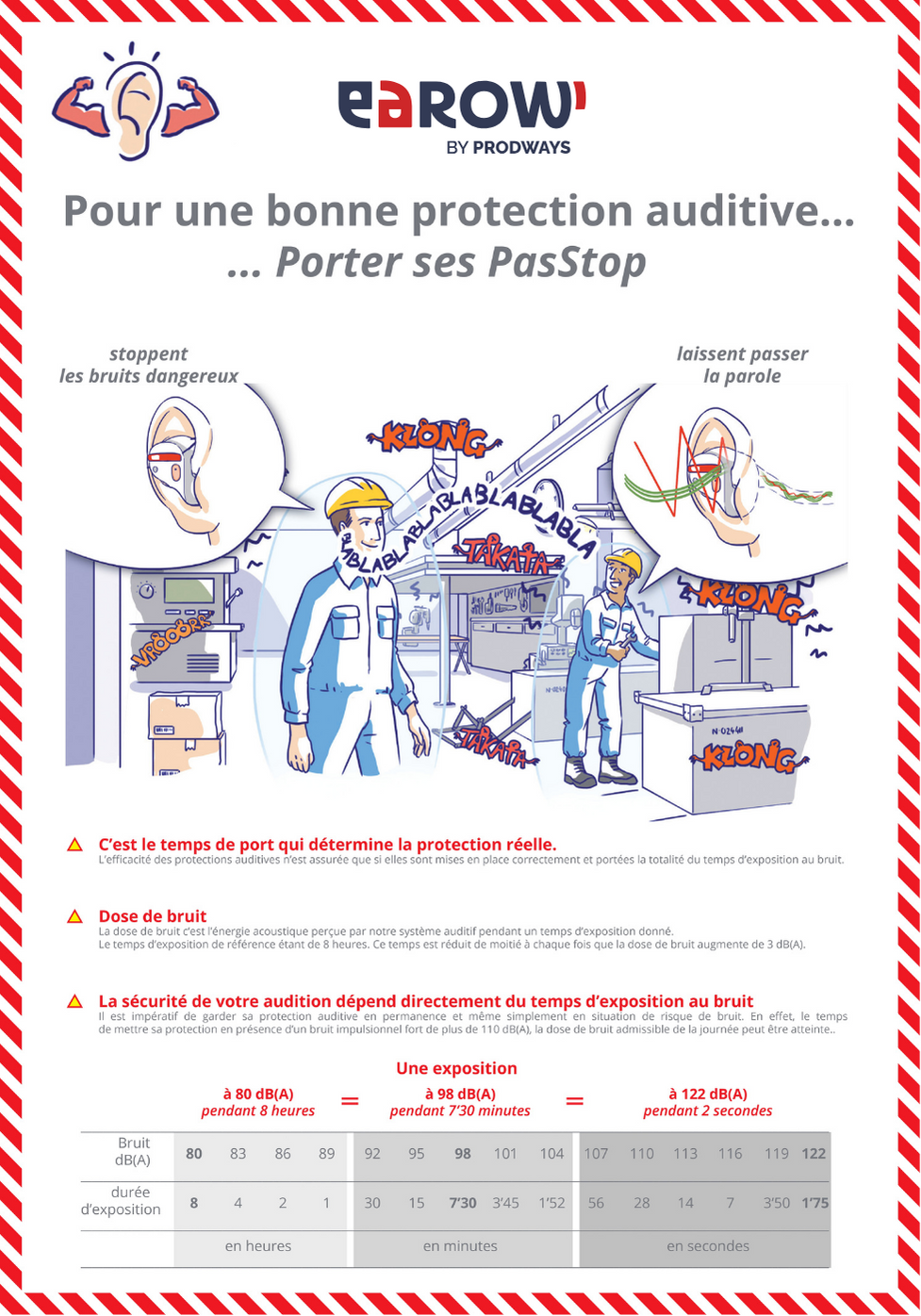 Il est essentiel que vos affiches soient placées dans des endroits stratégiques tels que l'entrée des ateliers, les salles de pause et les sanitaires. Pour maintenir l'attention sur le risque lié au bruit, pensez à renouveler régulièrement les messages en changeant vos affiches. Assurez vous que vos supports soient visibles de loin et attirent l'attention de vos collaborateurs en utilisant des illustrations.