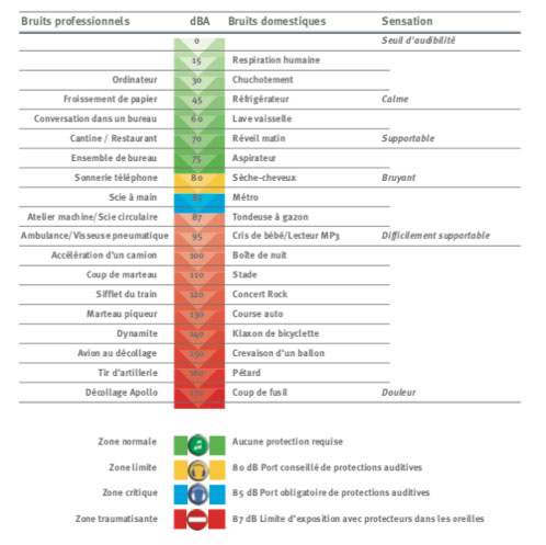 Nous remarquons que le seuil d’exposition limite est équivalent à 80dB. A partir de ce montant-là, il est nécessaire de s’équiper de protection auditive afin de prévenir tout risque de détérioration auditive.